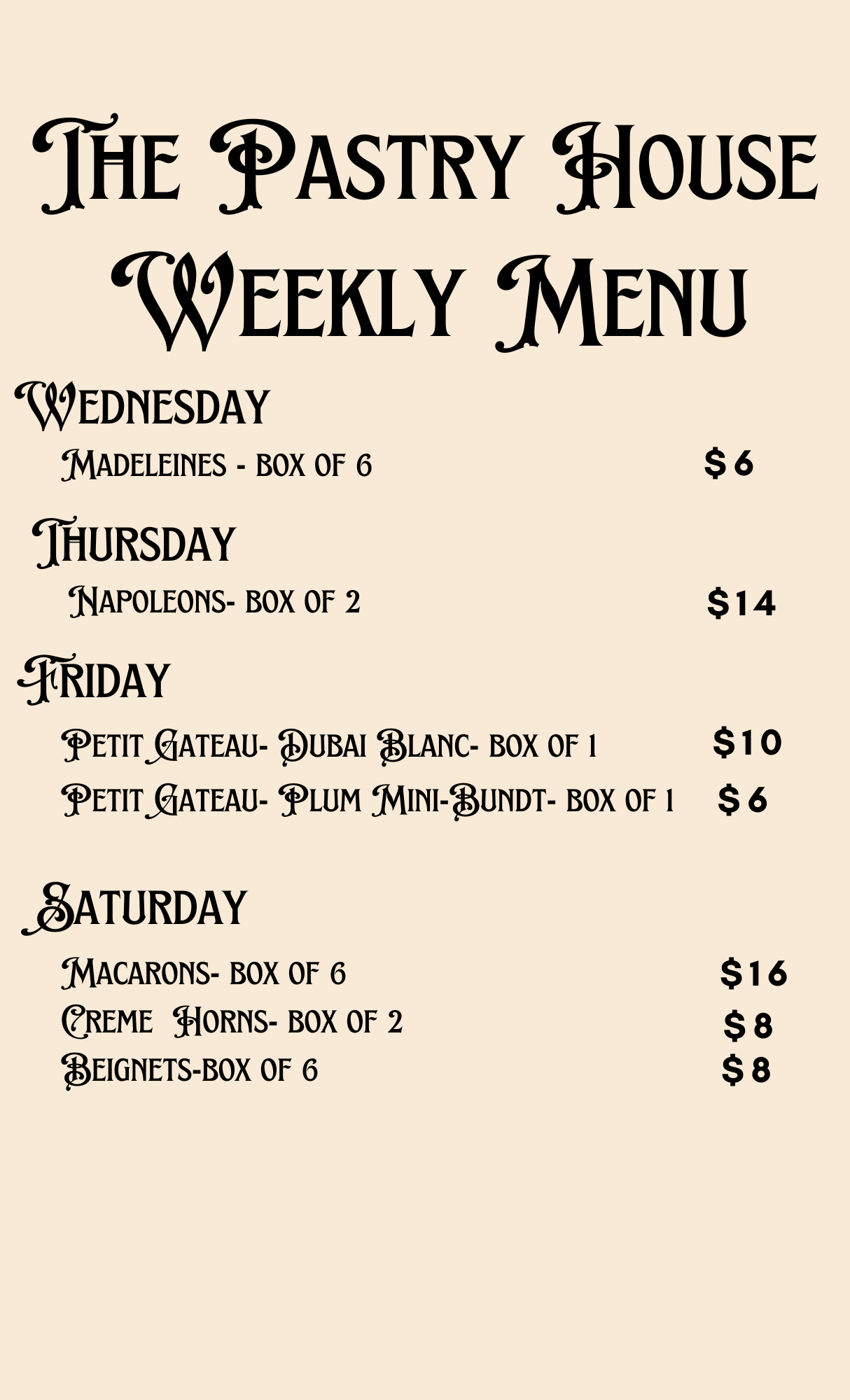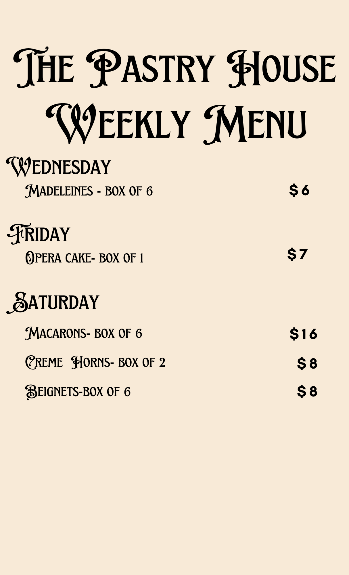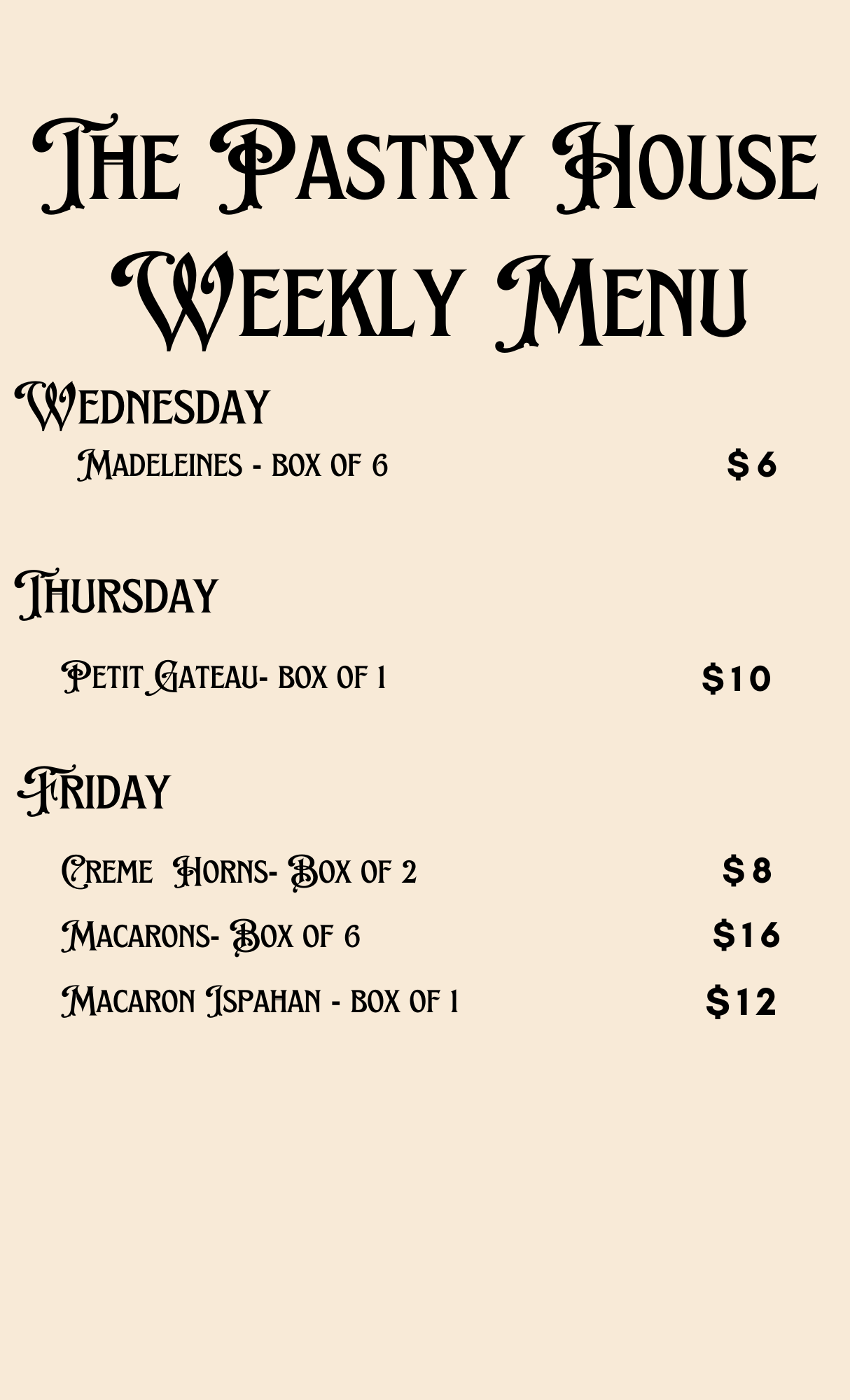Check out our weekly menu! To assure your order is fresh, items must be pre-ordered at least 24 hours in advance. Pick-up and delivery of all items will be on their regular menu day each week.